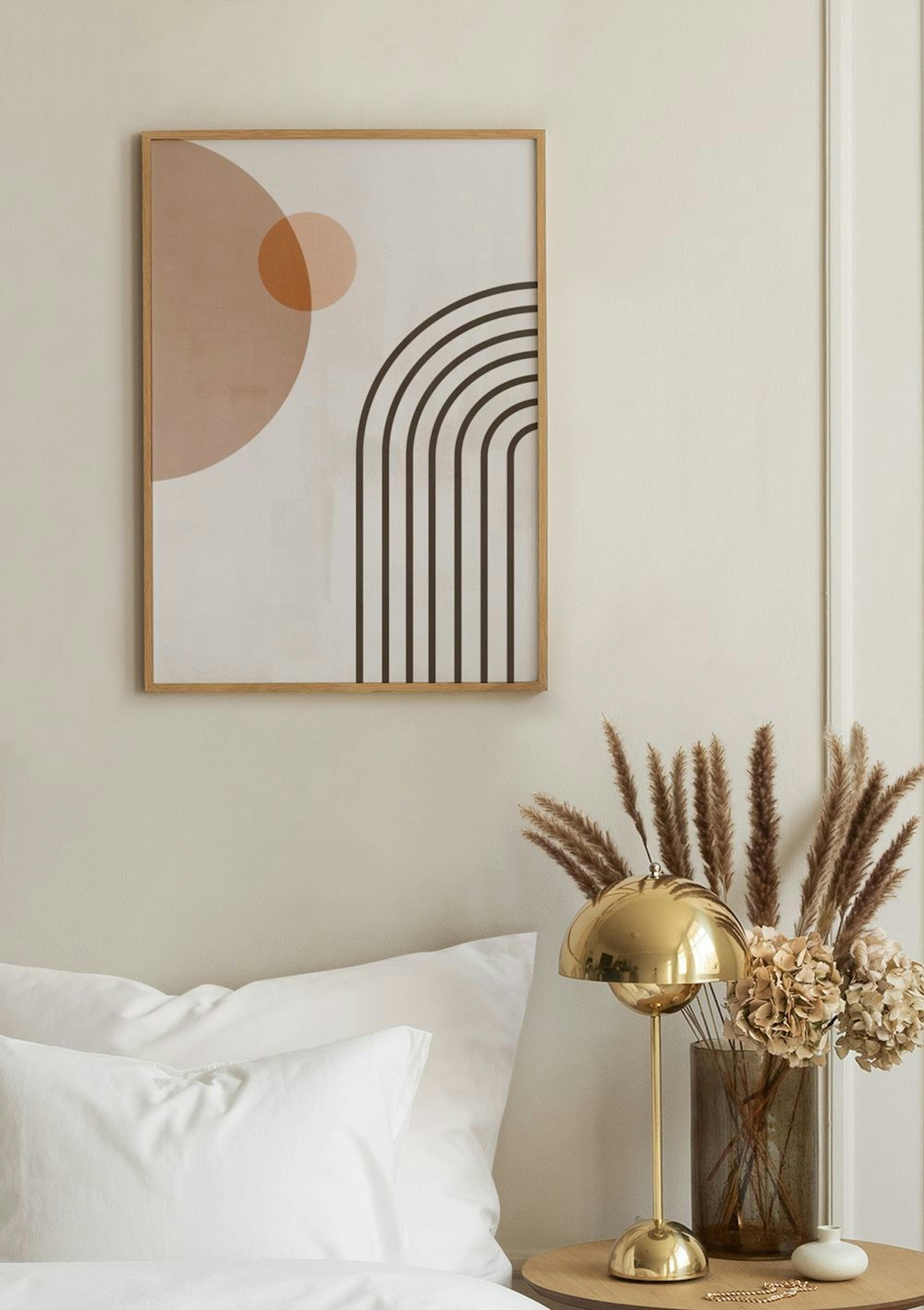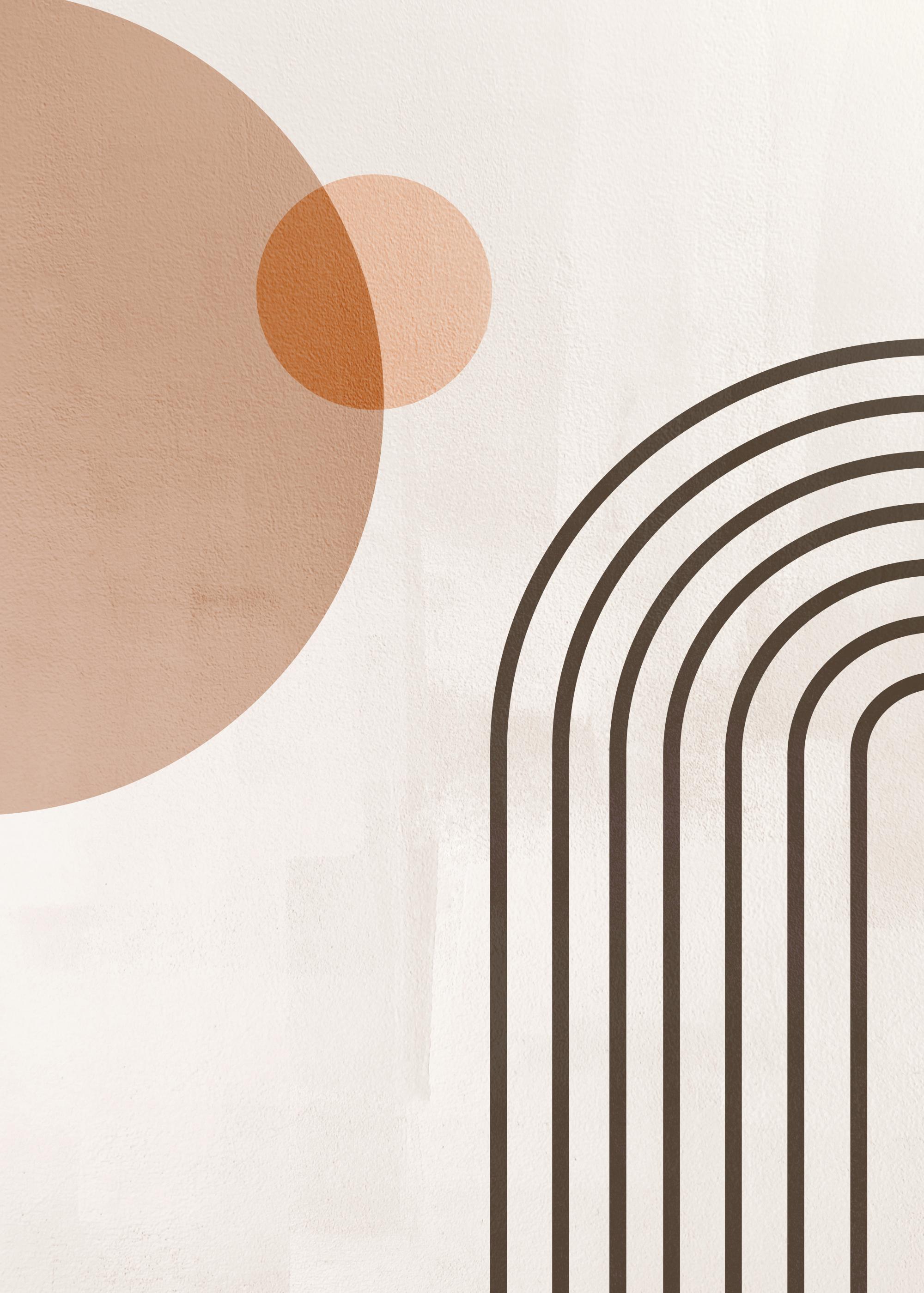 Enkel poster med geometriska former. En ljusbrun cirkel överlappar en mörkare mot beige bakgrund. Sju svarta linjer bildar en båge. Perfekt som tavla eller som del av en tavelvägg.