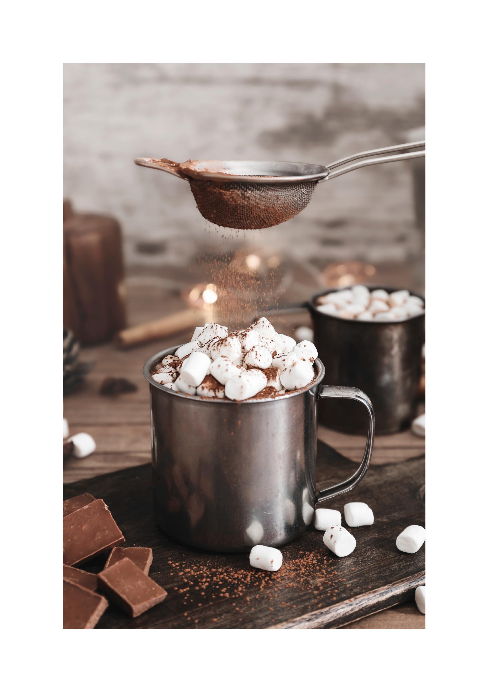 En fotoposter av en kopp varm choklad toppad med marshmallows och med stänk av kanel. Man kan nästan känna smaken av den varma chokladen bara genom att titta på denna affisch, och den kommer att vara ett perfekt inslag på köksväggen när du vill skapa julstämning!