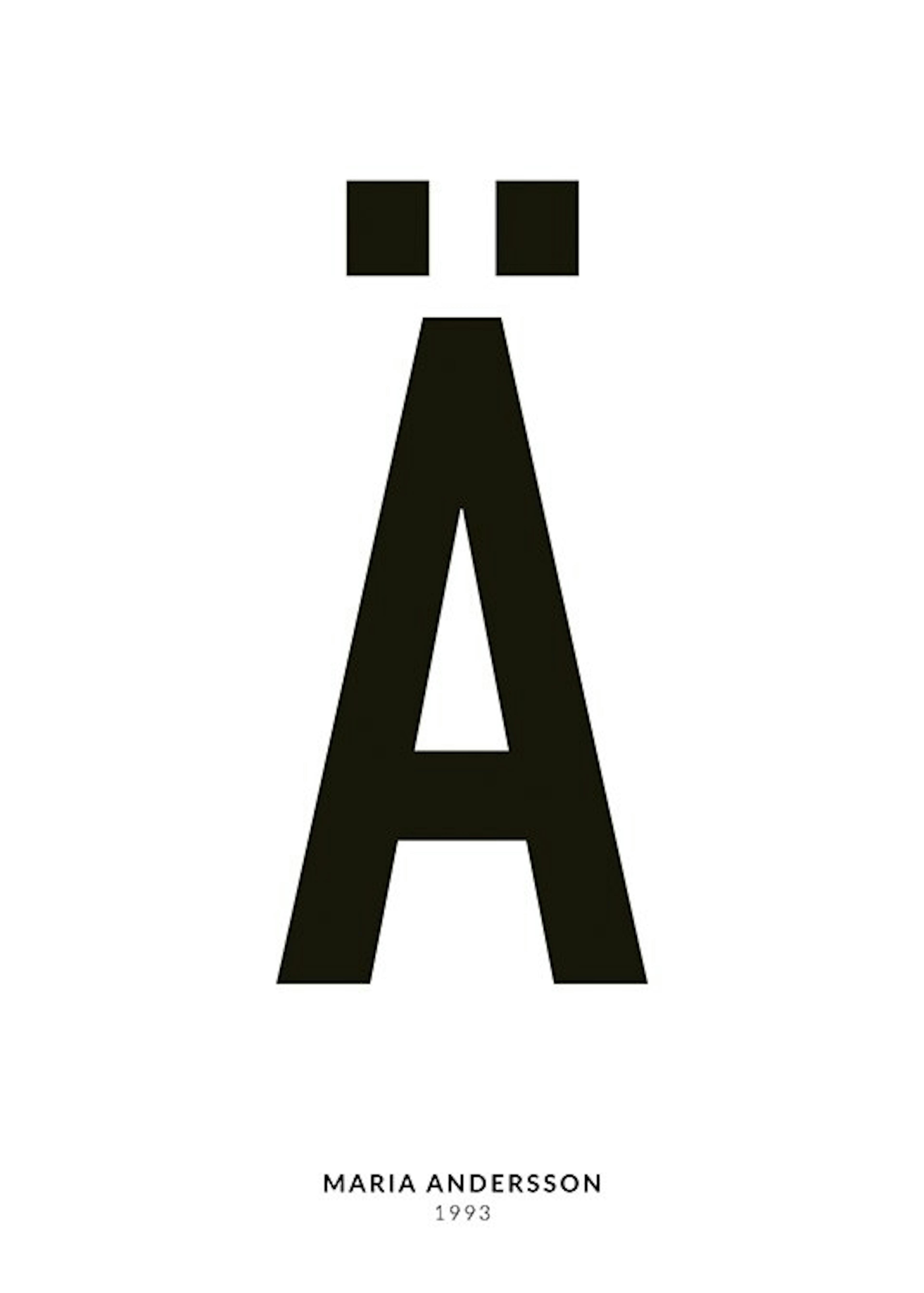 Texttavla med bokstaven Ä i svart på en vit bakgrund, med mindre svart text att anpassa under. Med personliga posters kan du anpassa din egen poster, genom att lägga till antingen egen text, namn eller datum. Det är ett roligt sätt att göra din egen konst personlig och kul att ge som en gåva till någon annan.