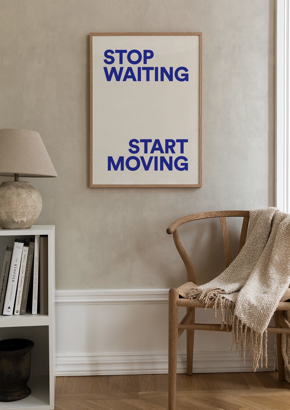 Motiverande poster med texten "STOP WAITING" och "START MOVING" i blått mot en ljusbeige bakgrund. Perfekt om du vill ha en påminnelse om att börja agera.